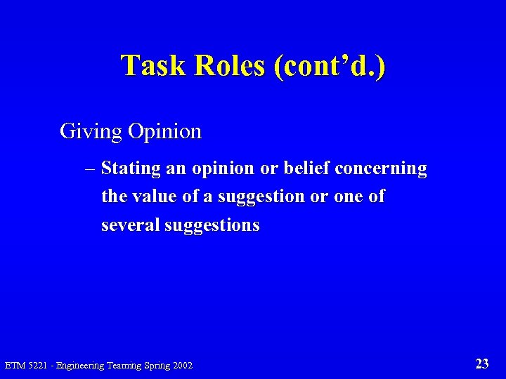Task Roles (cont’d. ) Giving Information – Offering facts or generalizations – Relating one's own pertinent experience to the group problem to illustrate points ETM 5221 - Engineering Teaming Spring 2002 22