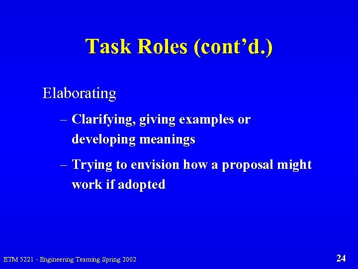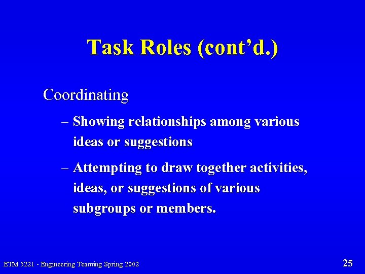 Task Roles (cont’d. ) Elaborating – Clarifying, giving examples or developing meanings – Trying to envision how a proposal might work if adopted ETM 5221 - Engineering Teaming Spring 2002 24