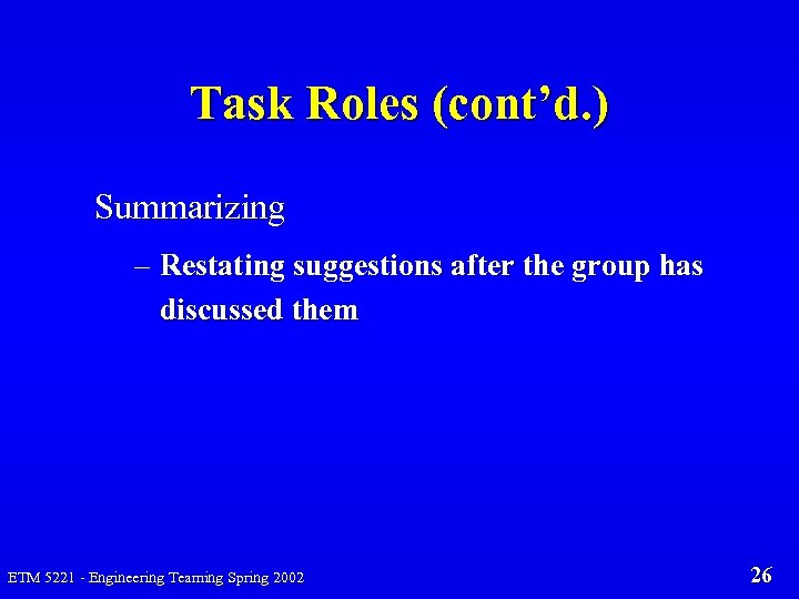 Task Roles (cont’d. ) Coordinating – Showing relationships among various ideas or suggestions – Attempting to draw together activities, ideas, or suggestions of various subgroups or members. ETM 5221 - Engineering Teaming Spring 2002 25