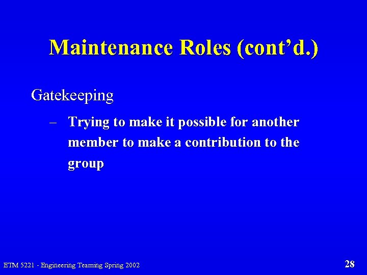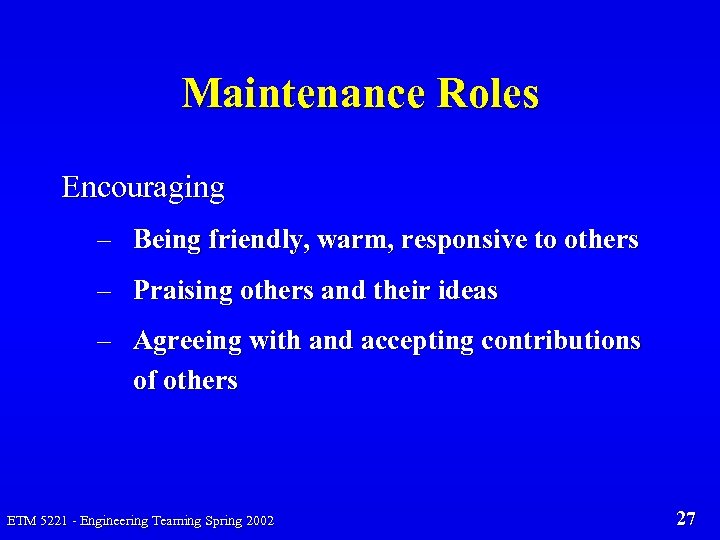 Maintenance Roles Encouraging – Being friendly, warm, responsive to others – Praising others and their ideas – Agreeing with and accepting contributions of others ETM 5221 - Engineering Teaming Spring 2002 27