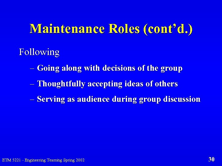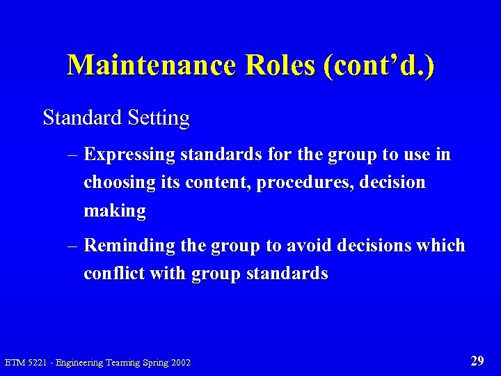 Maintenance Roles (cont’d. ) Standard Setting – Expressing standards for the group to use in choosing its content, procedures, decision making – Reminding the group to avoid decisions which conflict with group standards ETM 5221 - Engineering Teaming Spring 2002 29