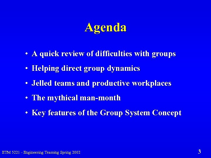 Agenda • A quick review of difficulties with groups • Helping direct group dynamics • Jelled teams and productive workplaces • The mythical man-month • Key features of the Group System Concept ETM 5221 - Engineering Teaming Spring 2002 3