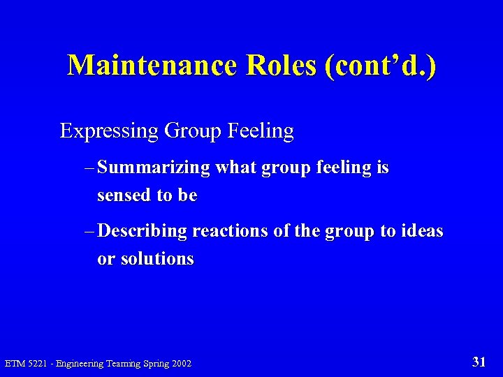 Maintenance Roles (cont’d. ) Following – Going along with decisions of the group – Thoughtfully accepting ideas of others – Serving as audience during group discussion ETM 5221 - Engineering Teaming Spring 2002 30