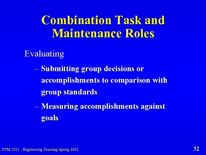 Combination Task and Maintenance Roles Evaluating – Submitting group decisions or accomplishments to comparison with group standards – Measuring accomplishments against goals ETM 5221 - Engineering Teaming Spring 2002 32