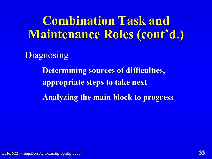 Combination Task and Maintenance Roles (cont’d. ) Diagnosing – Determining sources of difficulties, appropriate steps to take next – Analyzing the main block to progress ETM 5221 - Engineering Teaming Spring 2002 33