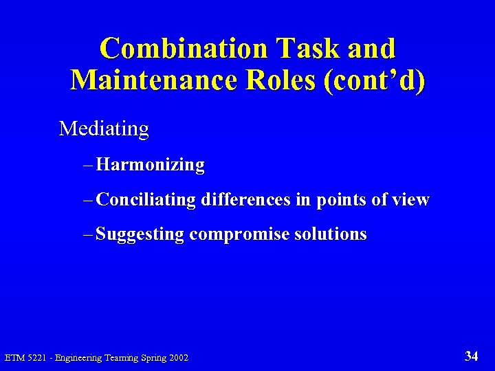 Combination Task and Maintenance Roles (cont’d) Mediating – Harmonizing – Conciliating differences in points of view – Suggesting compromise solutions ETM 5221 - Engineering Teaming Spring 2002 34