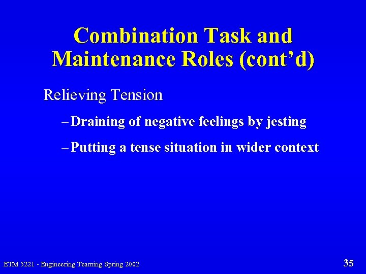 Combination Task and Maintenance Roles (cont’d) Relieving Tension – Draining of negative feelings by jesting – Putting a tense situation in wider context ETM 5221 - Engineering Teaming Spring 2002 35