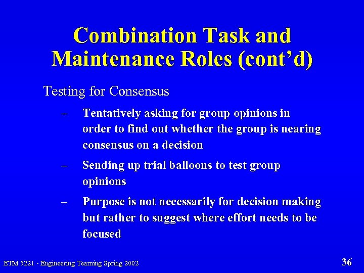 Combination Task and Maintenance Roles (cont’d) Testing for Consensus – Tentatively asking for group opinions in order to find out whether the group is nearing consensus on a decision – Sending up trial balloons to test group opinions – Purpose is not necessarily for decision making but rather to suggest where effort needs to be focused ETM 5221 - Engineering Teaming Spring 2002 36