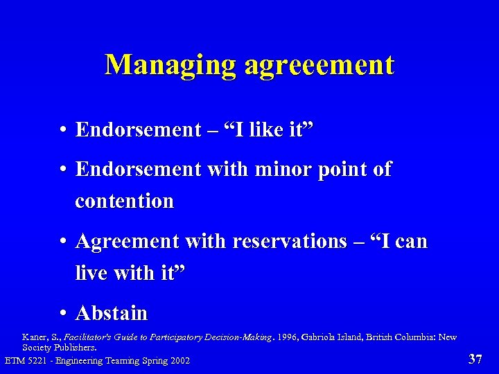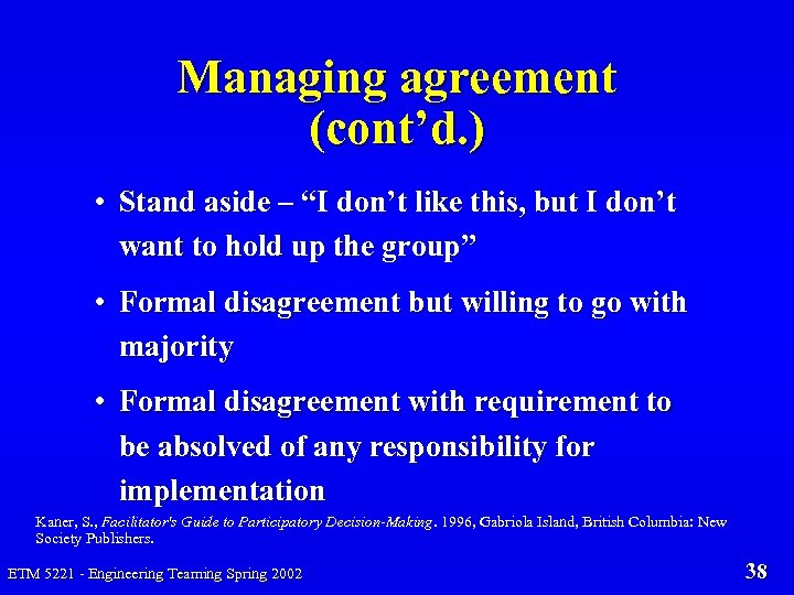 Managing agreeement • Endorsement – “I like it” • Endorsement with minor point of contention • Agreement with reservations – “I can live with it” • Abstain Kaner, S. , Facilitator's Guide to Participatory Decision-Making. 1996, Gabriola Island, British Columbia: New Society Publishers. ETM 5221 - Engineering Teaming Spring 2002 37