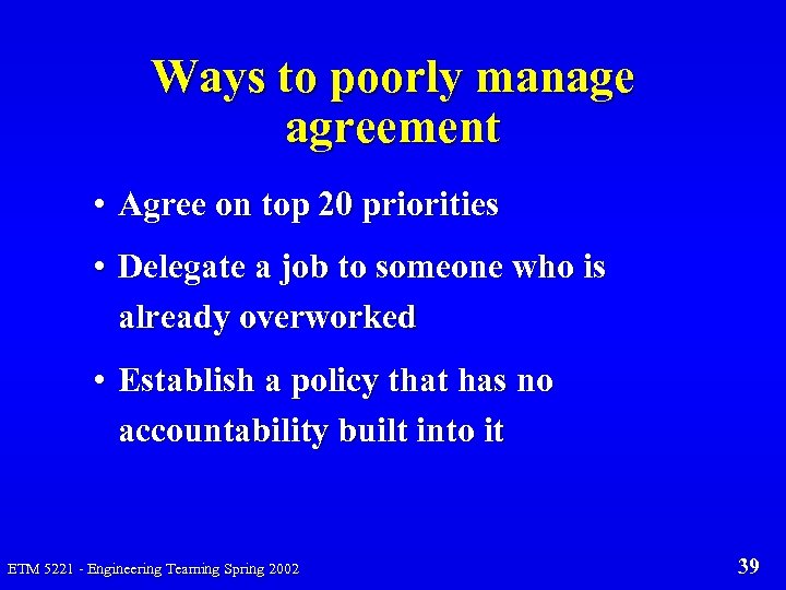 Ways to poorly manage agreement • Agree on top 20 priorities • Delegate a job to someone who is already overworked • Establish a policy that has no accountability built into it ETM 5221 - Engineering Teaming Spring 2002 39