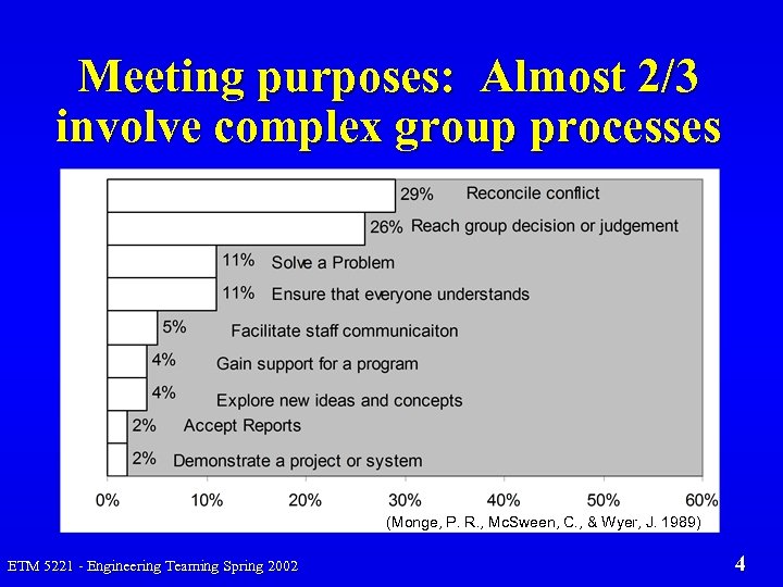 Meeting purposes: Almost 2/3 involve complex group processes (Monge, P. R. , Mc. Sween, C. , & Wyer, J. 1989) ETM 5221 - Engineering Teaming Spring 2002 4