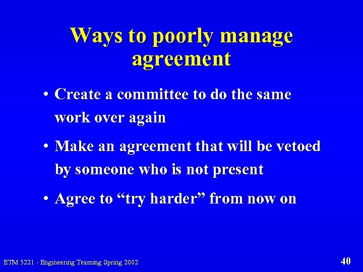 Ways to poorly manage agreement • Create a committee to do the same work over again • Make an agreement that will be vetoed by someone who is not present • Agree to “try harder” from now on ETM 5221 - Engineering Teaming Spring 2002 40