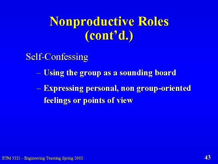 Nonproductive Roles (cont’d. ) Self-Confessing – Using the group as a sounding board – Expressing personal, non group-oriented feelings or points of view ETM 5221 - Engineering Teaming Spring 2002 43