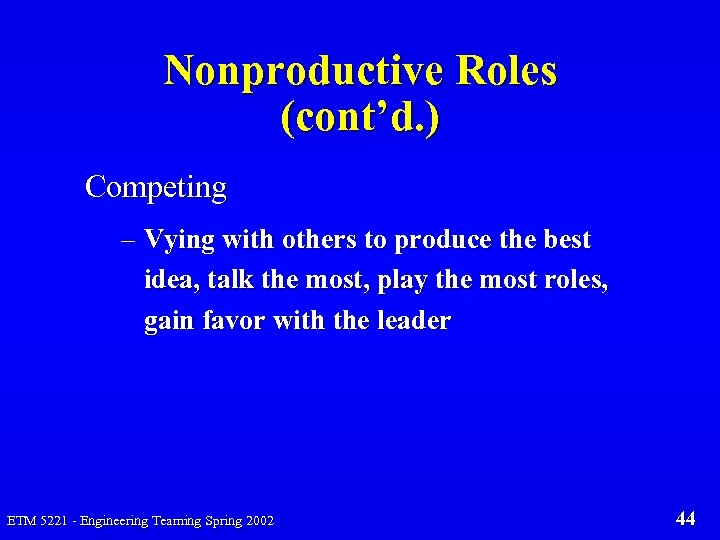 Nonproductive Roles (cont’d. ) Competing – Vying with others to produce the best idea, talk the most, play the most roles, gain favor with the leader ETM 5221 - Engineering Teaming Spring 2002 44