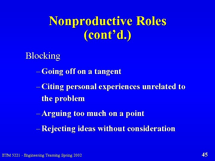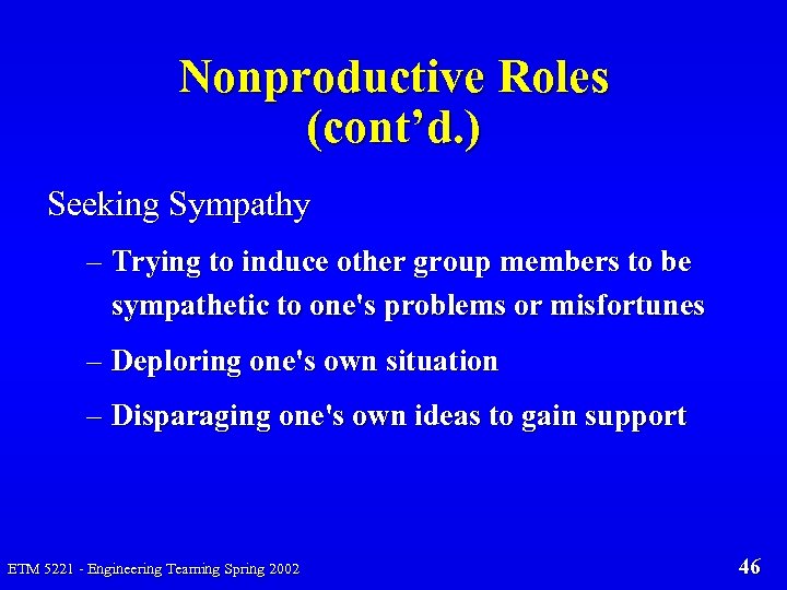 Nonproductive Roles (cont’d. ) Blocking – Going off on a tangent – Citing personal experiences unrelated to the problem – Arguing too much on a point – Rejecting ideas without consideration ETM 5221 - Engineering Teaming Spring 2002 45