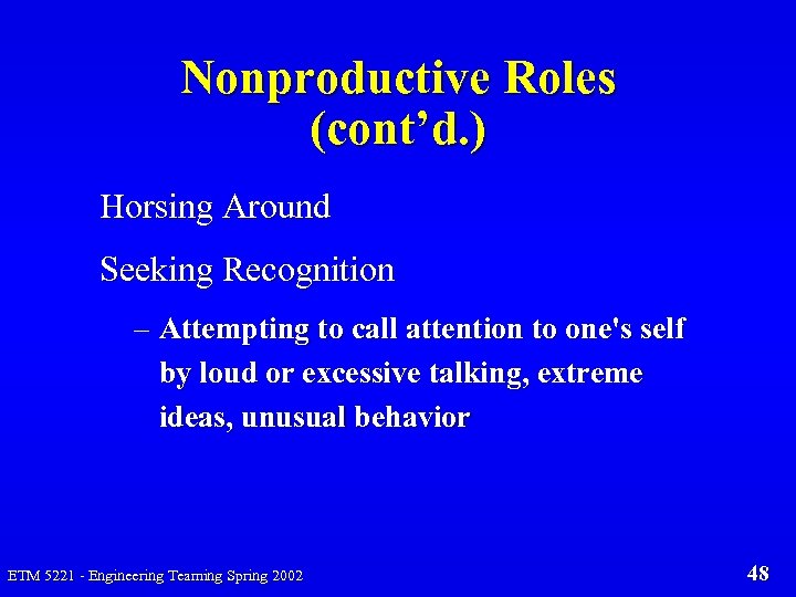 Nonproductive Roles (cont’d. ) Special Pleading – Introducing or supporting suggestions related to one's own pet concerns or philosophies, lobbying ETM 5221 - Engineering Teaming Spring 2002 47