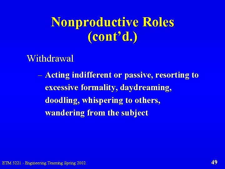 Nonproductive Roles (cont’d. ) Withdrawal – Acting indifferent or passive, resorting to excessive formality, daydreaming, doodling, whispering to others, wandering from the subject ETM 5221 - Engineering Teaming Spring 2002 49