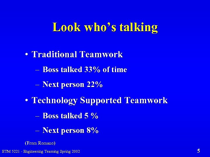Look who’s talking • Traditional Teamwork – Boss talked 33% of time – Next person 22% • Technology Supported Teamwork – Boss talked 5 % – Next person 8% (From Romano) ETM 5221 - Engineering Teaming Spring 2002 5