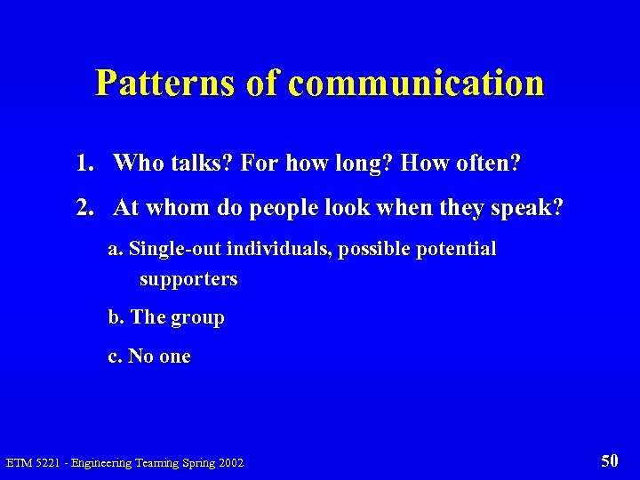 Patterns of communication 1. Who talks? For how long? How often? 2. At whom do people look when they speak? a. Single-out individuals, possible potential supporters b. The group c. No one ETM 5221 - Engineering Teaming Spring 2002 50