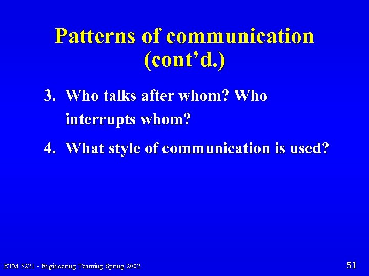 Patterns of communication (cont’d. ) 3. Who talks after whom? Who interrupts whom? 4. What style of communication is used? ETM 5221 - Engineering Teaming Spring 2002 51