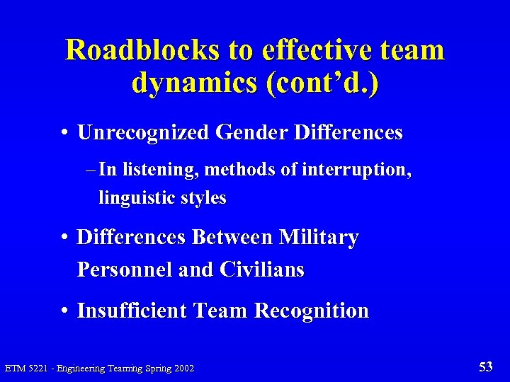 Roadblocks to effective team dynamics (cont’d. ) • Unrecognized Gender Differences – In listening, methods of interruption, linguistic styles • Differences Between Military Personnel and Civilians • Insufficient Team Recognition ETM 5221 - Engineering Teaming Spring 2002 53