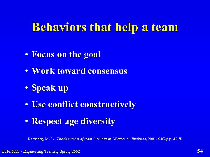 Behaviors that help a team • Focus on the goal • Work toward consensus • Speak up • Use conflict constructively • Respect age diversity Kamberg, M. -L. , The dynamics of team interaction. Women in Business, 2001. 53(2): p. 42 ff. ETM 5221 - Engineering Teaming Spring 2002 54