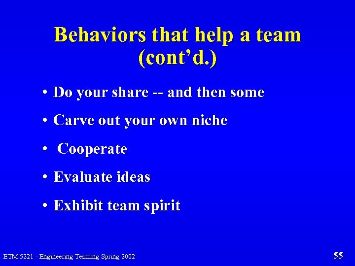 Behaviors that help a team (cont’d. ) • Do your share -- and then some • Carve out your own niche • Cooperate • Evaluate ideas • Exhibit team spirit ETM 5221 - Engineering Teaming Spring 2002 55
