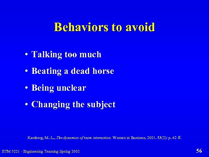 Behaviors to avoid • Talking too much • Beating a dead horse • Being unclear • Changing the subject Kamberg, M. -L. , The dynamics of team interaction. Women in Business, 2001. 53(2): p. 42 ff. ETM 5221 - Engineering Teaming Spring 2002 56