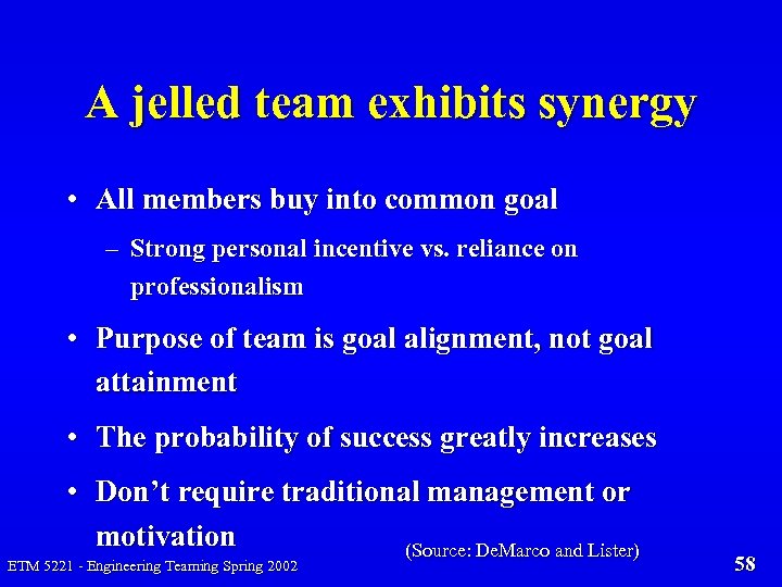 A jelled team exhibits synergy • All members buy into common goal – Strong personal incentive vs. reliance on professionalism • Purpose of team is goal alignment, not goal attainment • The probability of success greatly increases • Don’t require traditional management or motivation (Source: De. Marco and Lister) ETM 5221 - Engineering Teaming Spring 2002 58