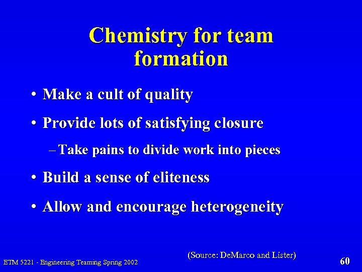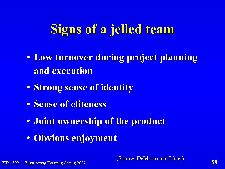 Signs of a jelled team • Low turnover during project planning and execution • Strong sense of identity • Sense of eliteness • Joint ownership of the product • Obvious enjoyment ETM 5221 - Engineering Teaming Spring 2002 (Source: De. Marco and Lister) 59