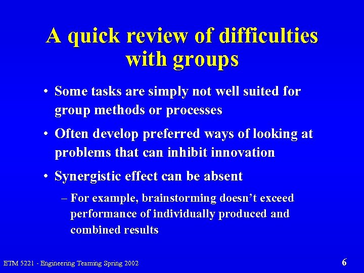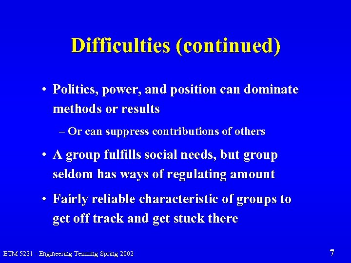 A quick review of difficulties with groups • Some tasks are simply not well suited for group methods or processes • Often develop preferred ways of looking at problems that can inhibit innovation • Synergistic effect can be absent – For example, brainstorming doesn’t exceed performance of individually produced and combined results ETM 5221 - Engineering Teaming Spring 2002 6