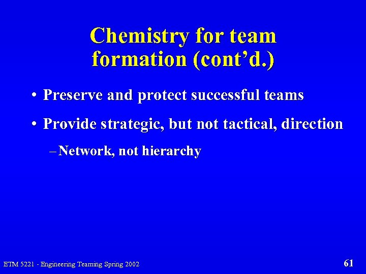 Chemistry for team formation (cont’d. ) • Preserve and protect successful teams • Provide strategic, but not tactical, direction – Network, not hierarchy ETM 5221 - Engineering Teaming Spring 2002 61