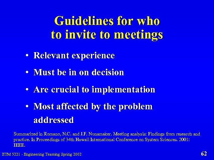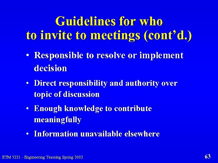 Guidelines for who to invite to meetings • Relevant experience • Must be in on decision • Are crucial to implementation • Most affected by the problem addressed Summarized in Romano, N. C. and J. F. Nunamaker. Meeting analysis: Findings from research and practice. In Proceedings of 34 th Hawaii International Conference on System Sciences. 2001: IEEE. ETM 5221 - Engineering Teaming Spring 2002 62