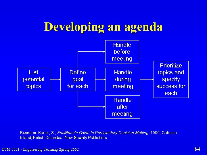 Developing an agenda Handle before meeting List potential topics Define goal for each Handle during meeting Prioritize topics and specify success for each Handle after meeting Based on Kaner, S. , Facilitator's Guide to Participatory Decision-Making. 1996, Gabriola Island, British Columbia: New Society Publishers. ETM 5221 - Engineering Teaming Spring 2002 64