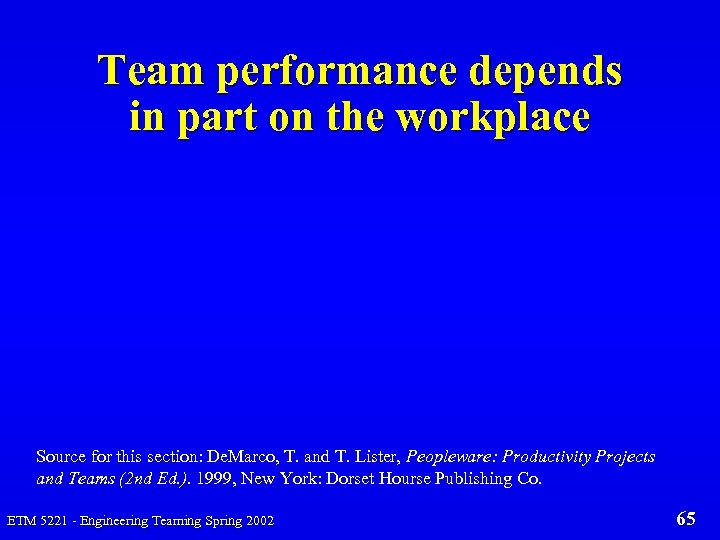 Team performance depends in part on the workplace Source for this section: De. Marco, T. and T. Lister, Peopleware: Productivity Projects and Teams (2 nd Ed. ). 1999, New York: Dorset Hourse Publishing Co. ETM 5221 - Engineering Teaming Spring 2002 65