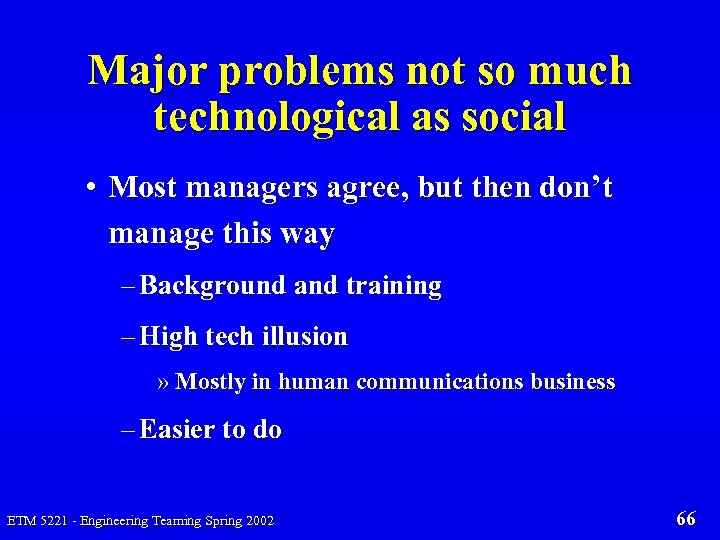 Major problems not so much technological as social • Most managers agree, but then don’t manage this way – Background and training – High tech illusion » Mostly in human communications business – Easier to do ETM 5221 - Engineering Teaming Spring 2002 66