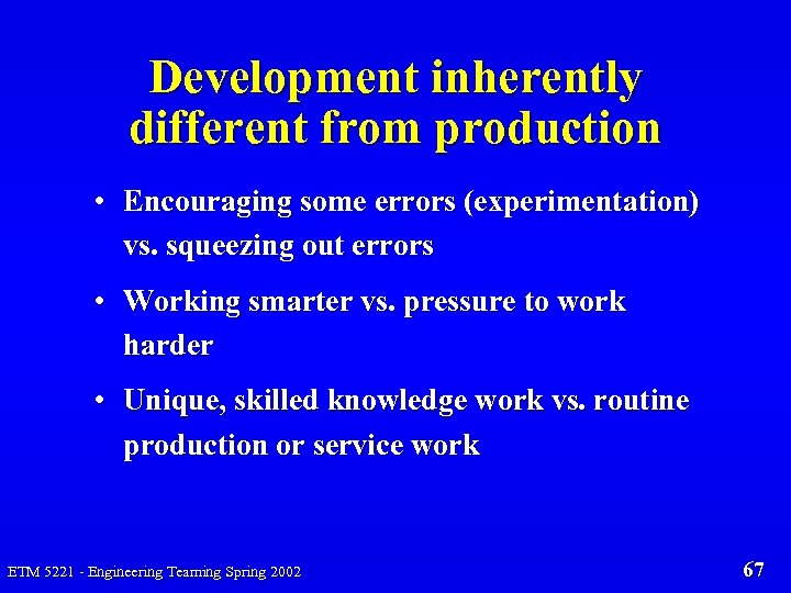 Development inherently different from production • Encouraging some errors (experimentation) vs. squeezing out errors • Working smarter vs. pressure to work harder • Unique, skilled knowledge work vs. routine production or service work ETM 5221 - Engineering Teaming Spring 2002 67