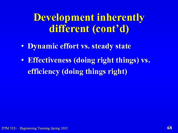 Development inherently different (cont’d) • Dynamic effort vs. steady state • Effectiveness (doing right things) vs. efficiency (doing things right) ETM 5221 - Engineering Teaming Spring 2002 68