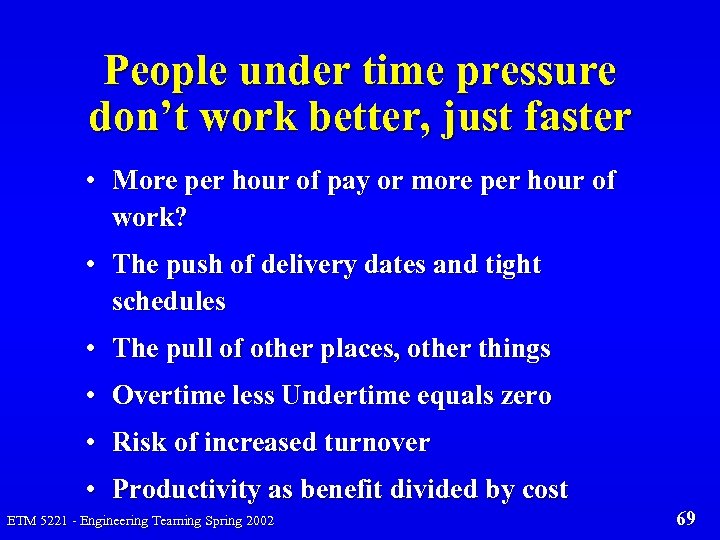 People under time pressure don’t work better, just faster • More per hour of pay or more per hour of work? • The push of delivery dates and tight schedules • The pull of other places, other things • Overtime less Undertime equals zero • Risk of increased turnover • Productivity as benefit divided by cost ETM 5221 - Engineering Teaming Spring 2002 69