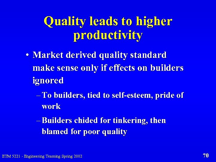 Quality leads to higher productivity • Market derived quality standard make sense only if effects on builders ignored – To builders, tied to self-esteem, pride of work – Builders chided for tinkering, then blamed for poor quality ETM 5221 - Engineering Teaming Spring 2002 70
