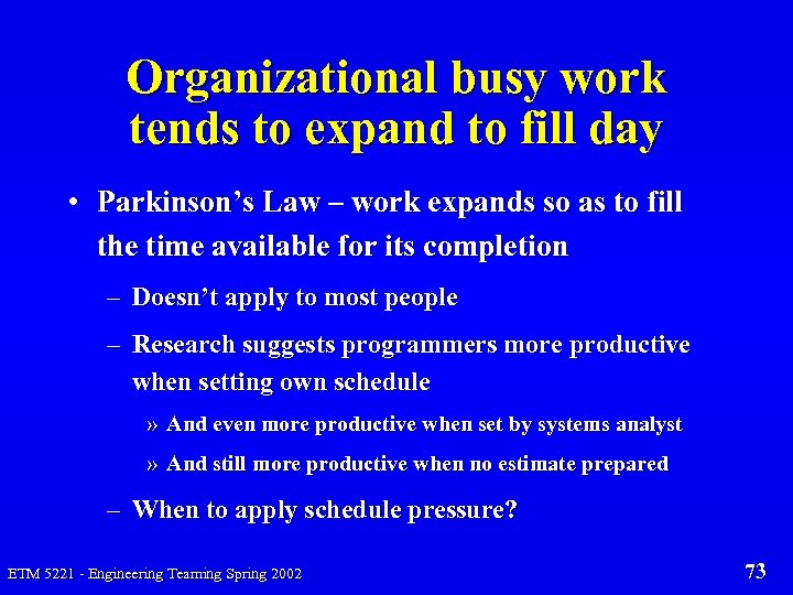 Organizational busy work tends to expand to fill day • Parkinson’s Law – work expands so as to fill the time available for its completion – Doesn’t apply to most people – Research suggests programmers more productive when setting own schedule » And even more productive when set by systems analyst » And still more productive when no estimate prepared – When to apply schedule pressure? ETM 5221 - Engineering Teaming Spring 2002 73