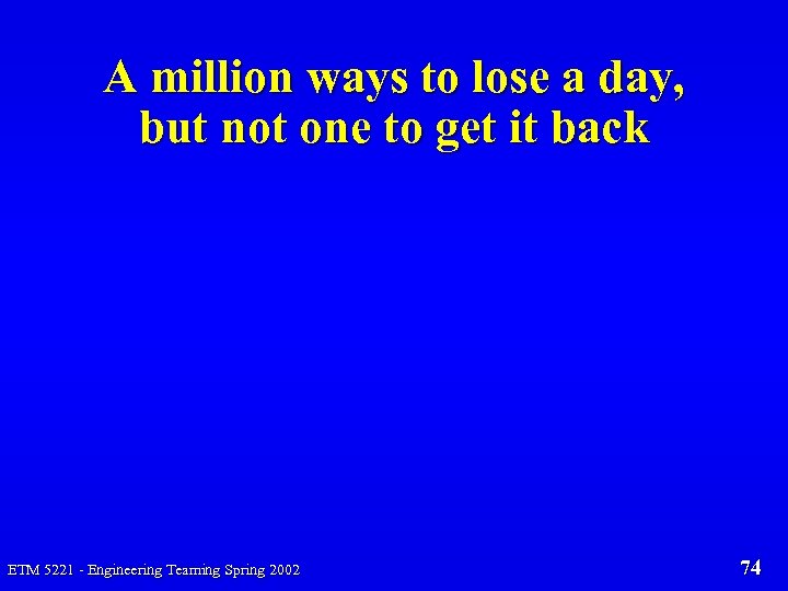 A million ways to lose a day, but not one to get it back ETM 5221 - Engineering Teaming Spring 2002 74