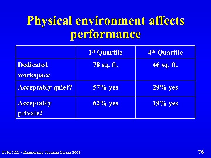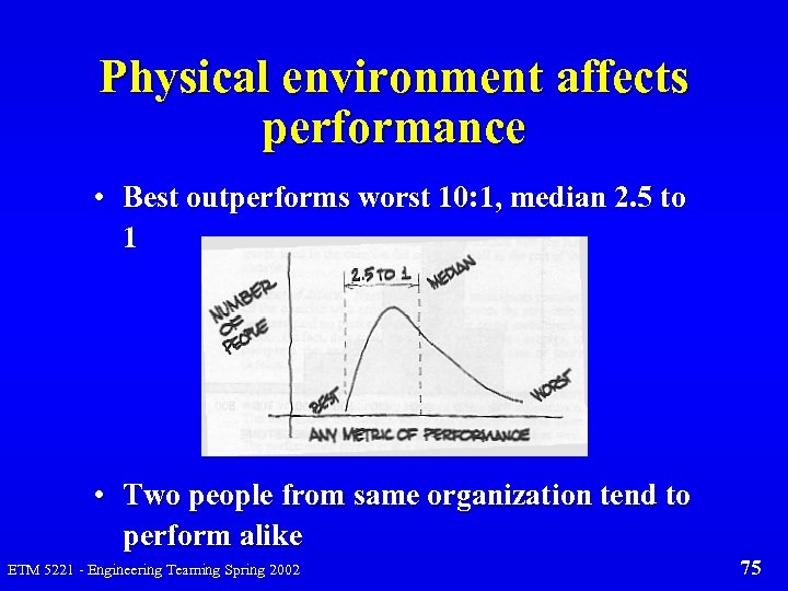 Physical environment affects performance • Best outperforms worst 10: 1, median 2. 5 to 1 • Two people from same organization tend to perform alike ETM 5221 - Engineering Teaming Spring 2002 75