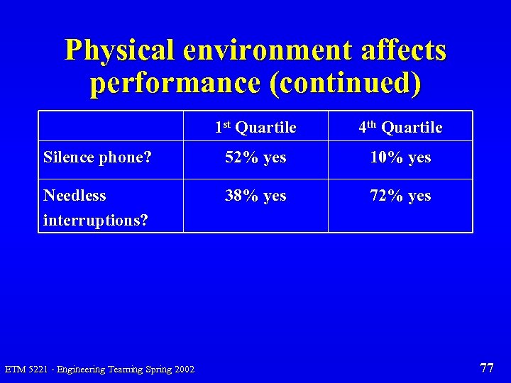 Physical environment affects performance 1 st Quartile 4 th Quartile Dedicated workspace 78 sq. ft. 46 sq. ft. Acceptably quiet? 57% yes 29% yes Acceptably private? 62% yes 19% yes ETM 5221 - Engineering Teaming Spring 2002 76