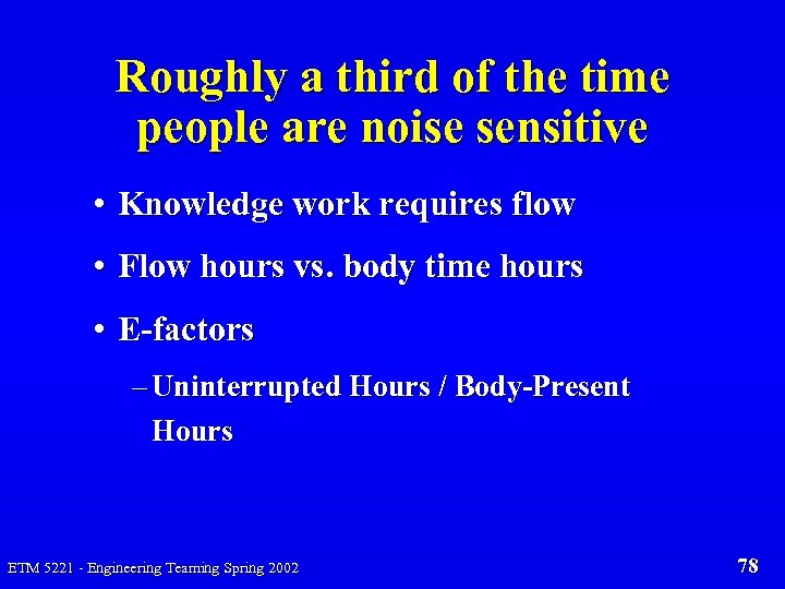 Roughly a third of the time people are noise sensitive • Knowledge work requires flow • Flow hours vs. body time hours • E-factors – Uninterrupted Hours / Body-Present Hours ETM 5221 - Engineering Teaming Spring 2002 78
