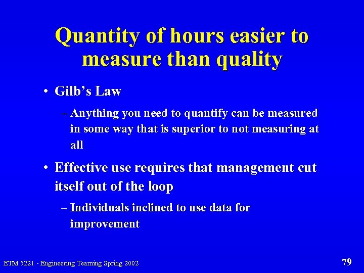 Quantity of hours easier to measure than quality • Gilb’s Law – Anything you need to quantify can be measured in some way that is superior to not measuring at all • Effective use requires that management cut itself out of the loop – Individuals inclined to use data for improvement ETM 5221 - Engineering Teaming Spring 2002 79
