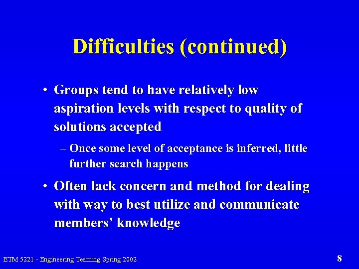 Difficulties (continued) • Politics, power, and position can dominate methods or results – Or can suppress contributions of others • A group fulfills social needs, but group seldom has ways of regulating amount • Fairly reliable characteristic of groups to get off track and get stuck there ETM 5221 - Engineering Teaming Spring 2002 7