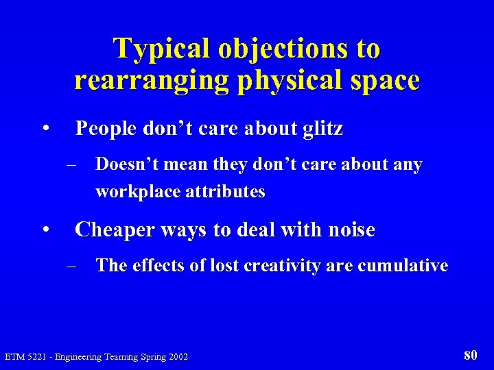 Typical objections to rearranging physical space • People don’t care about glitz – Doesn’t mean they don’t care about any workplace attributes • Cheaper ways to deal with noise – The effects of lost creativity are cumulative ETM 5221 - Engineering Teaming Spring 2002 80