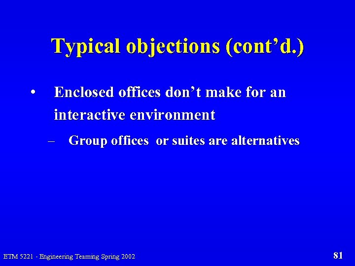 Typical objections (cont’d. ) • Enclosed offices don’t make for an interactive environment – Group offices or suites are alternatives ETM 5221 - Engineering Teaming Spring 2002 81