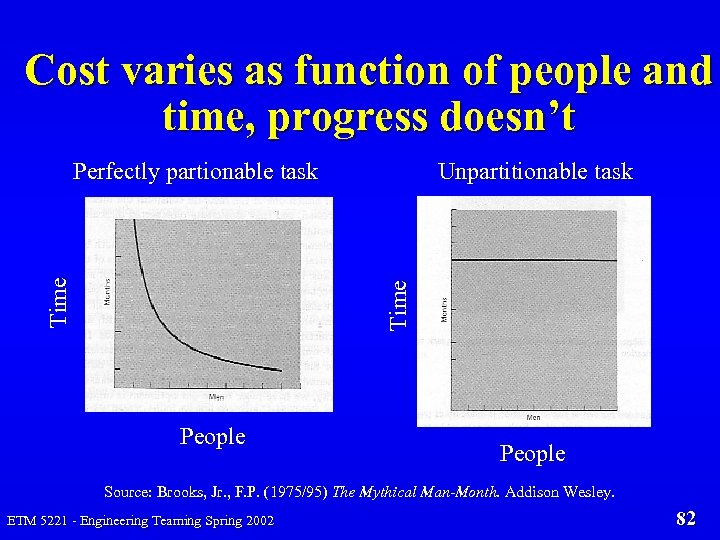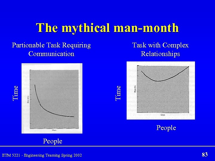 The mythical man-month Task with Complex Relationships Time Partionable Task Requiring Communication People ETM 5221 - Engineering Teaming Spring 2002 83
